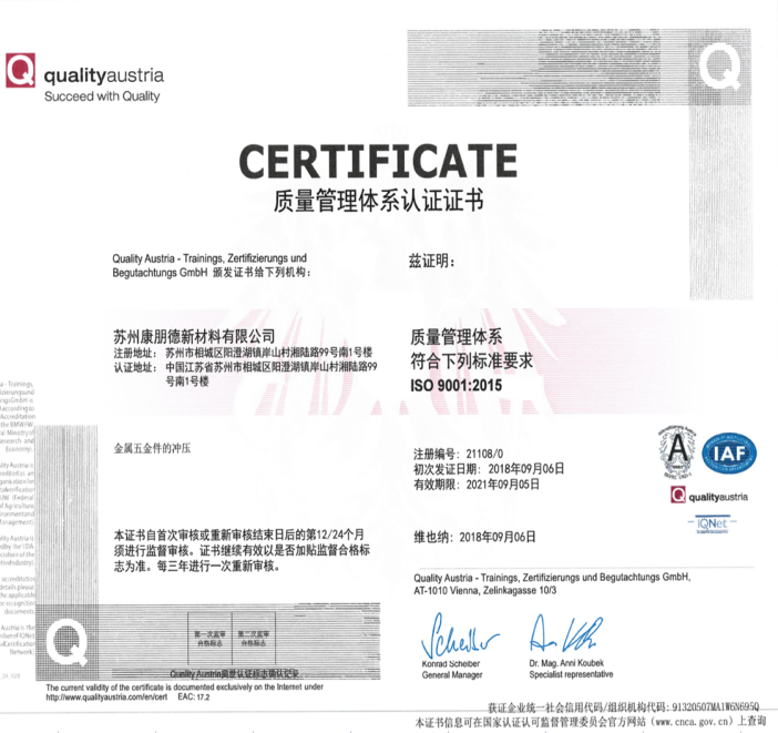 為了更好的使產品質量得到控制,使顧客更加滿意,內部管理水平得以提升,降低企業的管理成本并提高公司的工作效率,蘇州康朋德大力在內部推行ISO體系,讓公司管理更加系統和規范。并于2018年9月6日取得了認證。